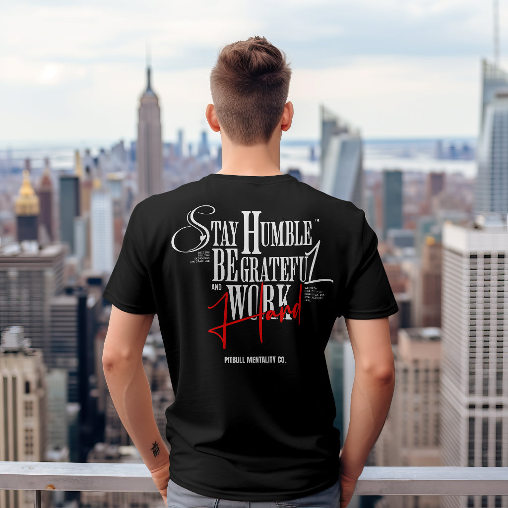 Make a statement with our "Stay Humble" Premium T-Shirt. This sophisticated design combines three essential principles of success: humility, gratitude, and hard work. The striking typography arrangement in white and red on a black canvas creates a powerful visual impact that resonates with those who understand that true greatness comes from staying grounded while pursuing excellence.